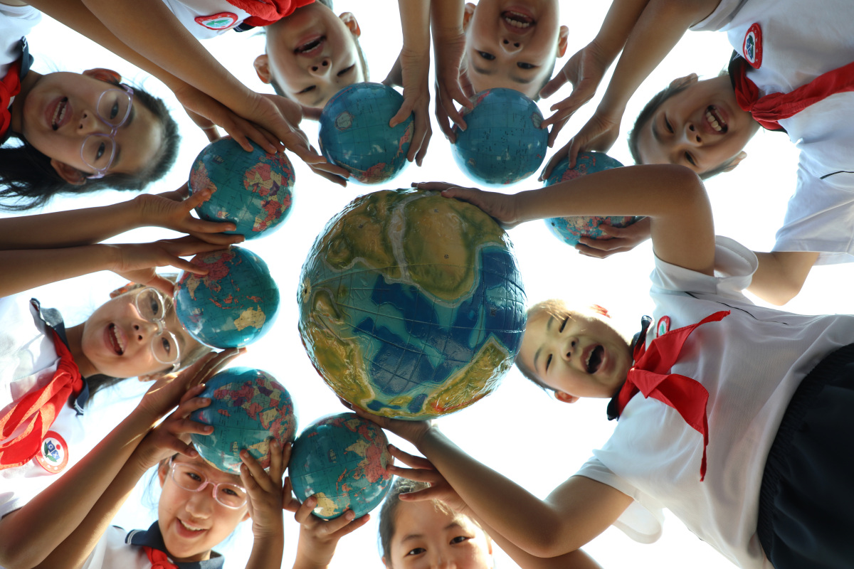 地球仪与一群不同的多民族儿童围成一圈,微笑着手牵着手.