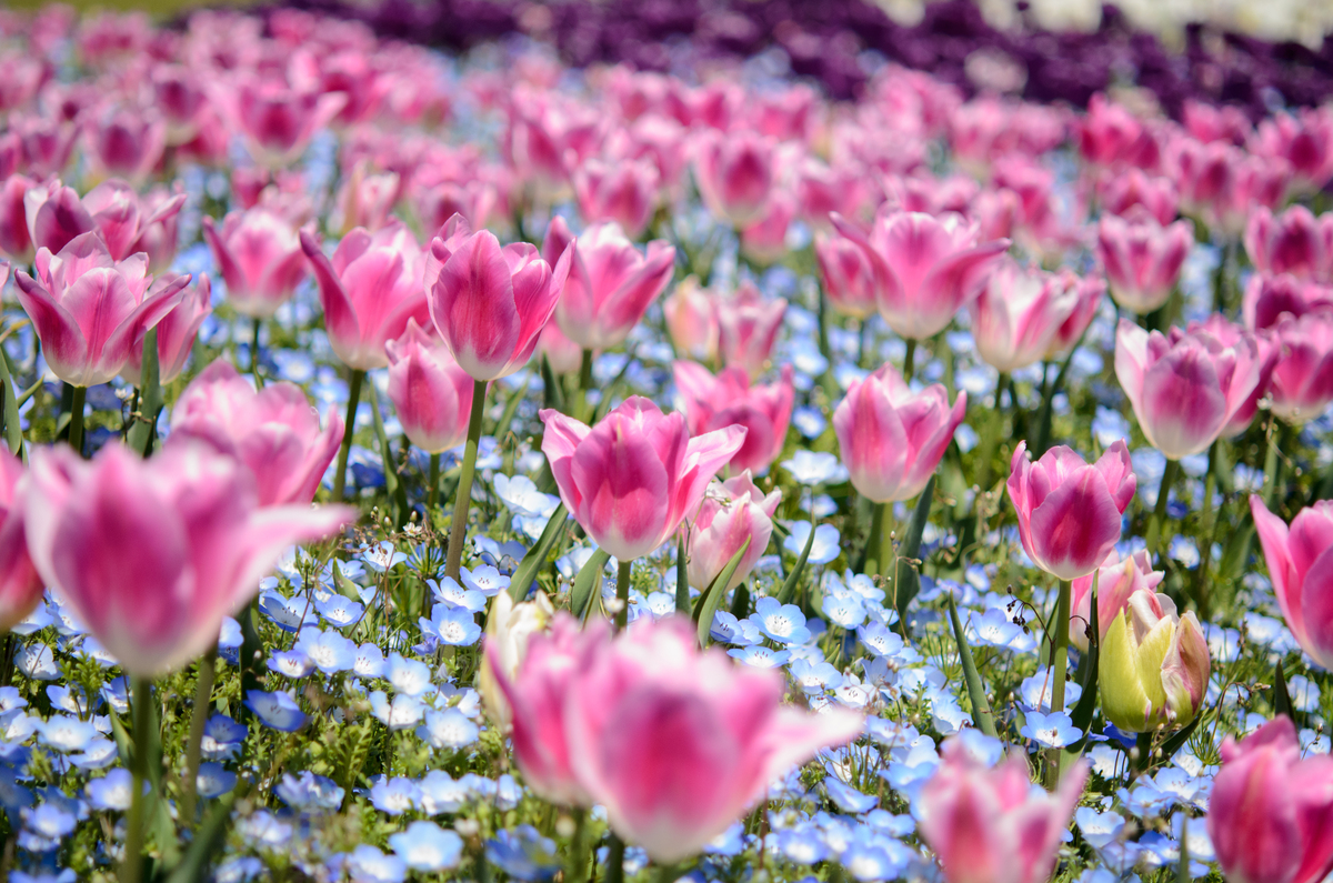 郁金香花海中的春日梦境 在这幅春日画卷中,深浅粉色的郁金香如同